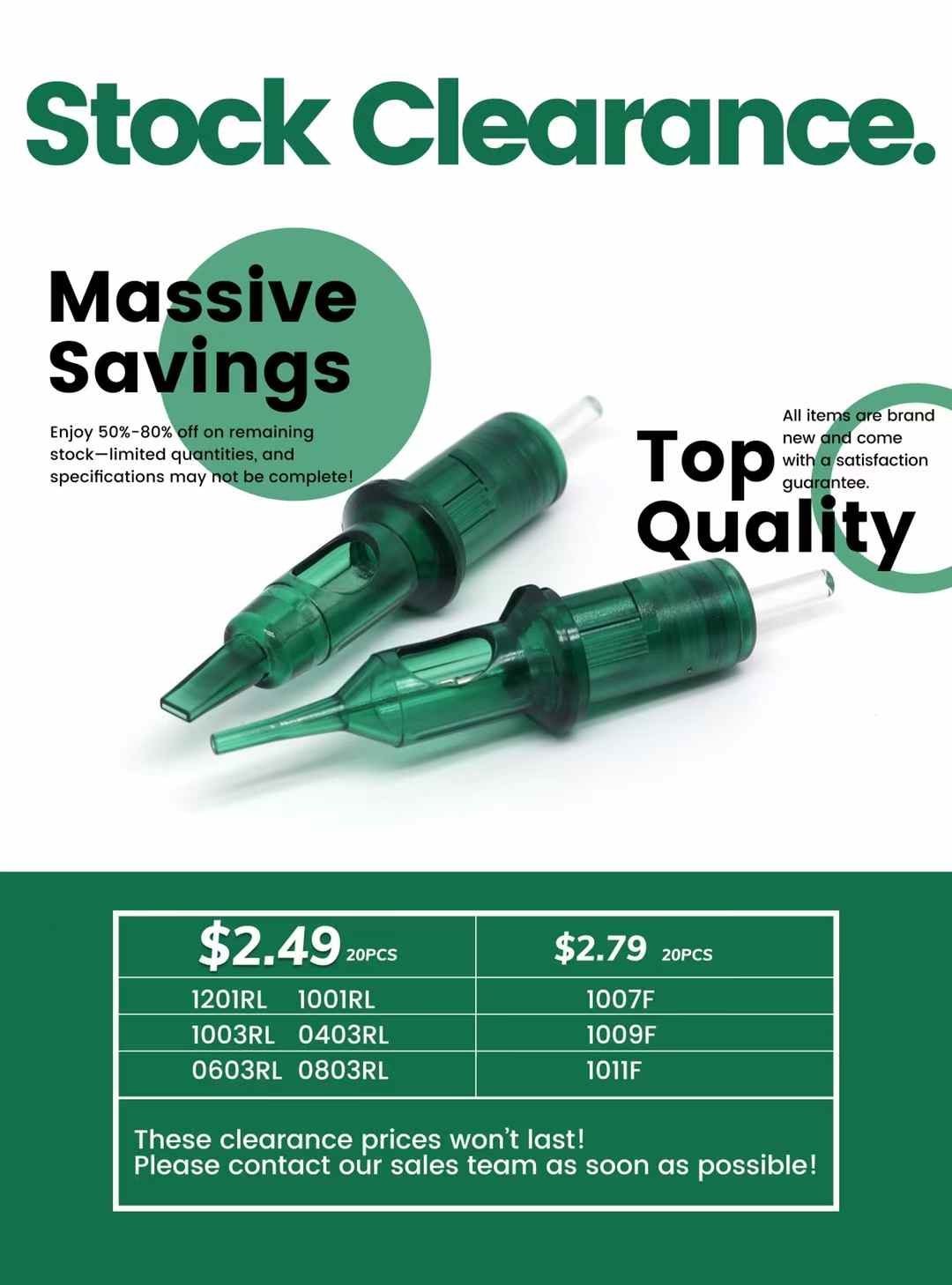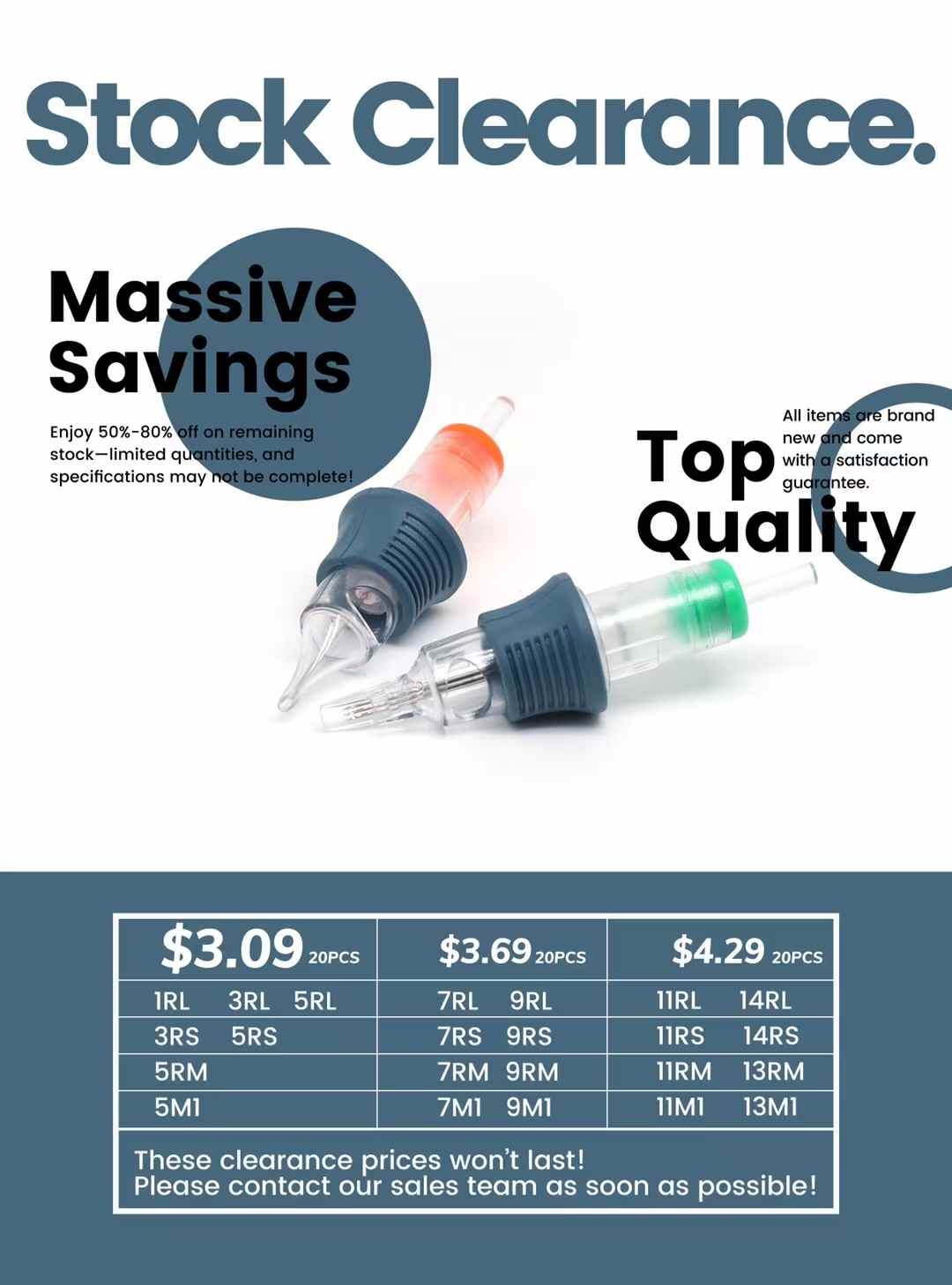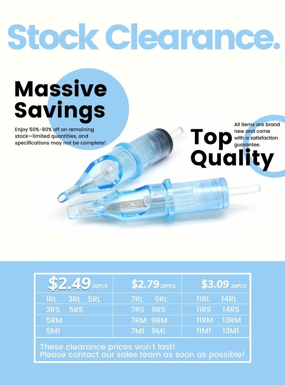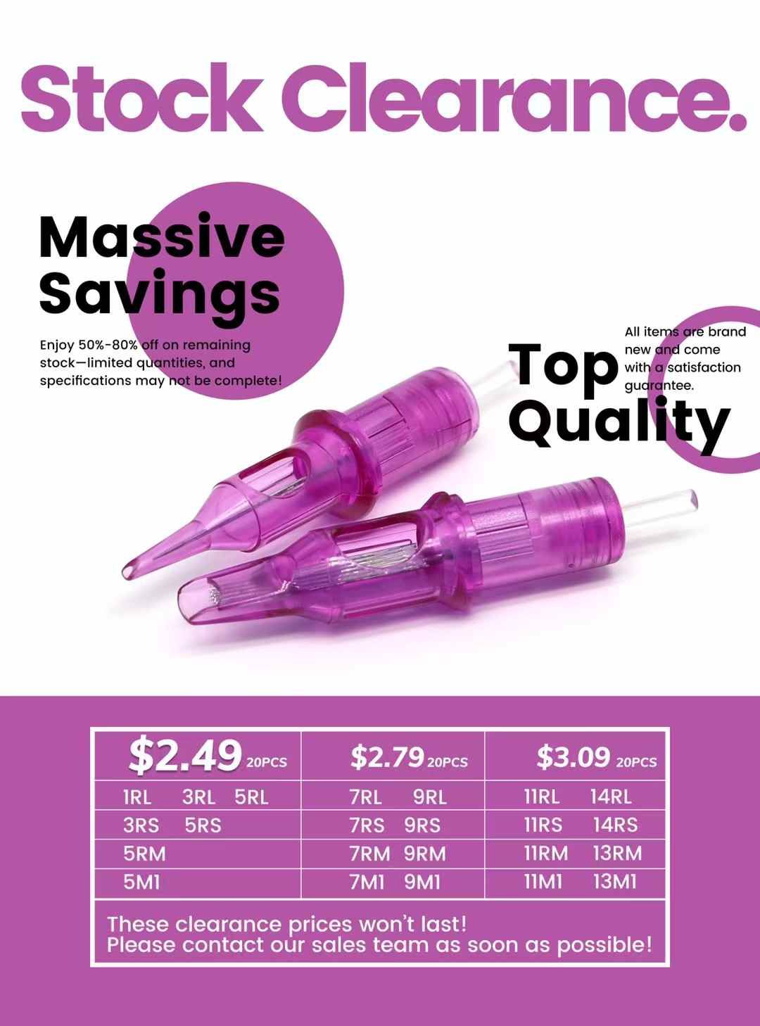 We’re clearing our warehouse to make room for new inventory! For a limited time, secure Tattoo Needle Cartridges at 50%~80% OFF standard wholesale rates. Orders are already coming in.